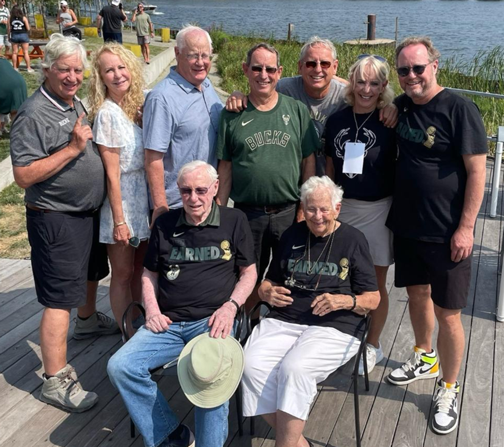 Family photo in Milwaukee, 2021, at NBA Championship after-party, Vince seated with Libby, his seven children from left to right: Jim, Theresa, Joe, Richard, Bill, Helen and Mike.